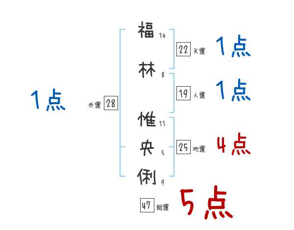 天運![]() | 福林惟央俐さんの天運は22画の1つ星!努力することが苦手ないっぽう手先が器用。芸術性にも優れる。 家系が持つ宿命的な運勢を表します。祖先から受け継いだ苗字ですので自分の力が及びません。家柄を象徴します。 |