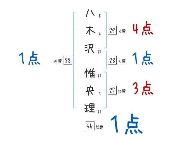 外運![]() | 八木沢惟央理さんの外運は28画の1つ星!家庭環境に注意。スポーツで活躍できる能力があるかも。 生活面を象徴する運勢です。外部から受ける影響力を表し、結婚運、家庭運や職場、環境への順応性を表します。 |