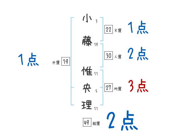 外運![]() | 小藤惟央理さんの外運は19画の1つ星!優れた才能を持ちますが、協調性が足りないことも。周りの人と協力する事を意識しましょう。 生活面を象徴する運勢です。外部から受ける影響力を表し、結婚運、家庭運や職場、環境への順応性を表します。 |