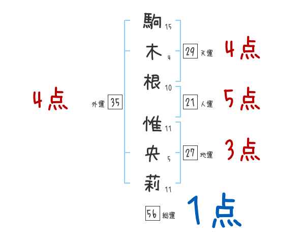 外運![]() | 駒木根惟央莉さんの外運は35画の4つ星!温厚な性格で感受性が高い。穏和な性格で人望が厚い。 生活面を象徴する運勢です。外部から受ける影響力を表し、結婚運、家庭運や職場、環境への順応性を表します。 |