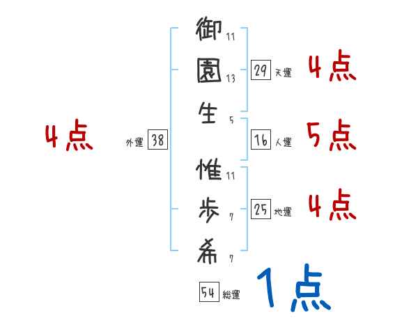人運![]() | 御園生惟歩希さんの人運は16画の5つ星!人望が厚く大きく発展する。逆転成功が見える。 性格や才能などを表す2番目に重要な運勢です。人間関係や協調性、社会的な成功に影響します。主に20歳から50歳ぐらいまでの中年期の運勢を表します。 |