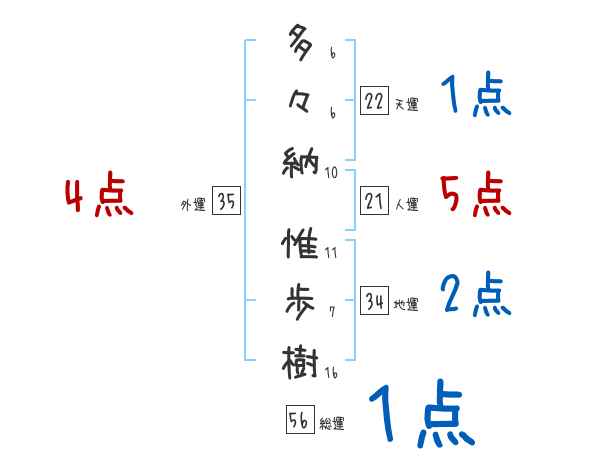 地運![]() | 多々納惟歩樹さんの地運は34画の2つ星!独創性に優れるが、自尊心が強く災難に注意しましょう。 個性を表す基礎的な運勢です。性格形成や対人関係、行動力など家庭環境に影響されます。主に誕生してから20歳くらいまでの若年期の運勢を表します。 |