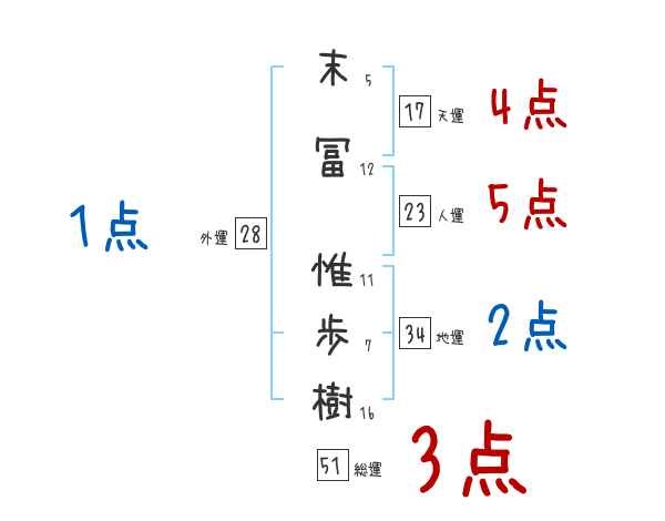 人運![]() | 末冨惟歩樹さんの人運は23画の5つ星!想像力に優れ活力がある。一代で成功し名誉を手に入れる。 性格や才能などを表す2番目に重要な運勢です。人間関係や協調性、社会的な成功に影響します。主に20歳から50歳ぐらいまでの中年期の運勢を表します。 |