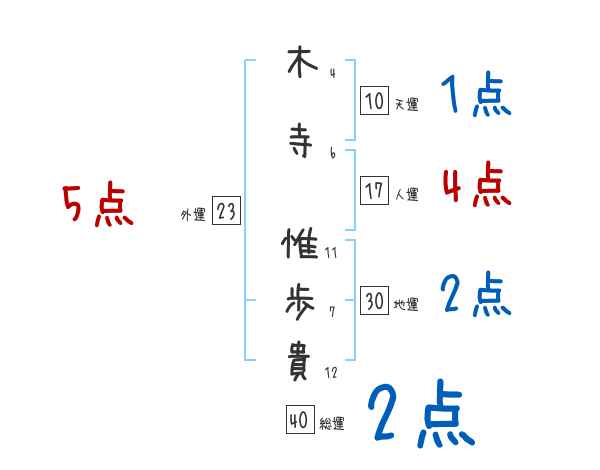 外運![]() | 木寺惟歩貴さんの外運は23画の5つ星!想像力に優れ活力がある。一代で成功し名誉を手に入れる。 生活面を象徴する運勢です。外部から受ける影響力を表し、結婚運、家庭運や職場、環境への順応性を表します。 |
