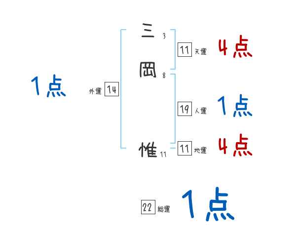 天運![]() | 三岡惟さんの天運は11画の4つ星!着実に富や地位を得る幸運な人生。 家系が持つ宿命的な運勢を表します。祖先から受け継いだ苗字ですので自分の力が及びません。家柄を象徴します。 |