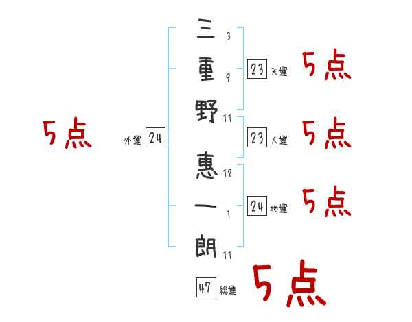 総運![]() | 三重野惠一朗さんの総運は47画の5つ星!実力が開花し発展する円満な人生。財に恵まれる。 あなたの人生を表す1番重要な運勢です。生涯を通じて影響する総合運となり、主に50歳以降の晩年期に影響を及ぼします。 |