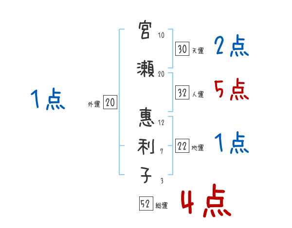 人運![]() | 宮瀬惠利子さんの人運は32画の5つ星!柔軟性があり成功する。チャンスが多く金運が良い。 性格や才能などを表す2番目に重要な運勢です。人間関係や協調性、社会的な成功に影響します。主に20歳から50歳ぐらいまでの中年期の運勢を表します。 |