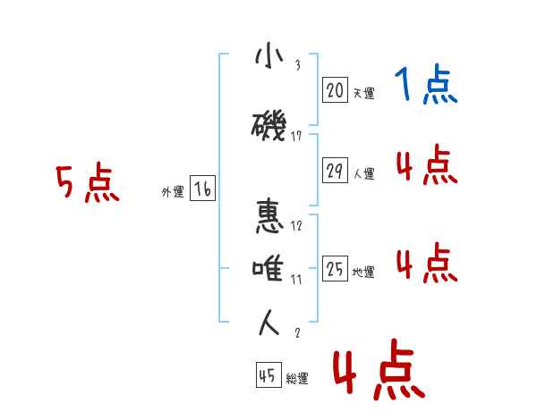 外運![]() | 小磯惠唯人さんの外運は16画の5つ星!人望が厚く大きく発展する。逆転成功が見える。 生活面を象徴する運勢です。外部から受ける影響力を表し、結婚運、家庭運や職場、環境への順応性を表します。 |