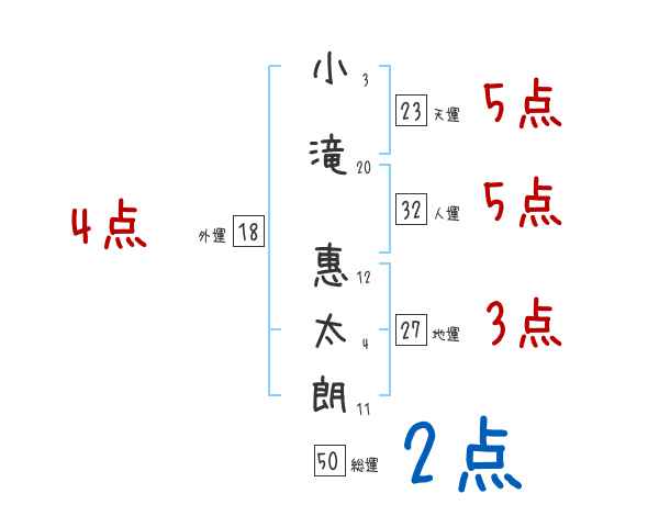 | 人運  | 小滝惠太朗さんの人運は32画の5つ星!柔軟性があり成功する。チャンスが多く金運が良い。性格や才能などを表す2番目に重要な運勢です。人間関係や協調性、社会的な成功に影響します。主に20歳から50歳ぐらいまでの中年期の運勢を表します。 |