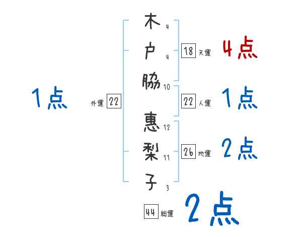 外運![]() | 木戸脇惠梨子さんの外運は22画の1つ星!努力することが苦手ないっぽう手先が器用。芸術性にも優れる。 生活面を象徴する運勢です。外部から受ける影響力を表し、結婚運、家庭運や職場、環境への順応性を表します。 |