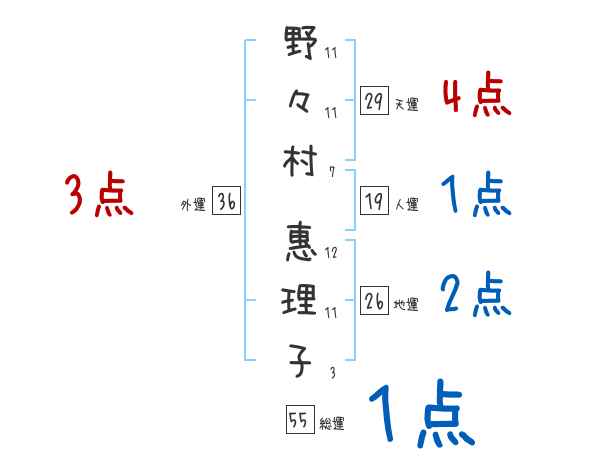 天運![]() | 野々村惠理子さんの天運は29画の4つ星!完全主義で才能がある。厳格な心の持ち主。 家系が持つ宿命的な運勢を表します。祖先から受け継いだ苗字ですので自分の力が及びません。家柄を象徴します。 |
