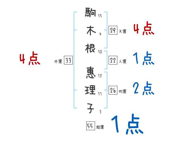 天運![]() | 駒木根惠理子さんの天運は29画の4つ星!完全主義で才能がある。厳格な心の持ち主。 家系が持つ宿命的な運勢を表します。祖先から受け継いだ苗字ですので自分の力が及びません。家柄を象徴します。 |
