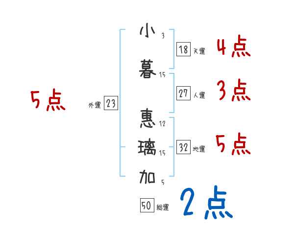 外運![]() | 小暮惠璃加さんの外運は23画の5つ星!想像力に優れ活力がある。一代で成功し名誉を手に入れる。 生活面を象徴する運勢です。外部から受ける影響力を表し、結婚運、家庭運や職場、環境への順応性を表します。 |