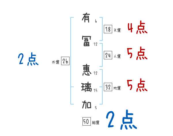 天運![]() | 有冨惠璃加さんの天運は18画の4つ星!情熱的で剛気。忍耐力があり信頼される。 家系が持つ宿命的な運勢を表します。祖先から受け継いだ苗字ですので自分の力が及びません。家柄を象徴します。 |