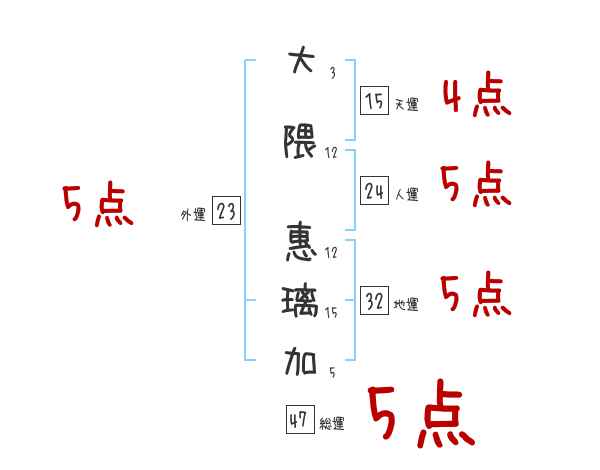 天運![]()  | 大隈惠璃加さんの天運は15画の4つ星!人徳があり出世する。順調に物事を進め円満な人生。 家系が持つ宿命的な運勢を表します。祖先から受け継いだ苗字ですので自分の力が及びません。家柄を象徴します。 |