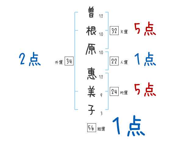 天運![]() | 曽根原惠美子さんの天運は32画の5つ星!柔軟性があり成功する。チャンスが多く金運が良い。 家系が持つ宿命的な運勢を表します。祖先から受け継いだ苗字ですので自分の力が及びません。家柄を象徴します。 |