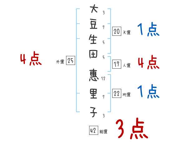 総運![]() | 大豆生田惠里子さんの総運は42画の3つ星!病気に注意。多芸であるが消極的でおとなしい。 あなたの人生を表す1番重要な運勢です。生涯を通じて影響する総合運となり、主に50歳以降の晩年期に影響を及ぼします。 |