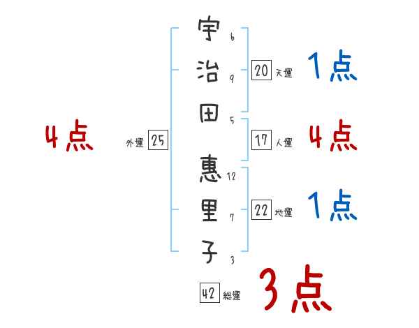 総運![]() | 宇治田惠里子さんの総運は42画の3つ星!病気に注意。多芸であるが消極的でおとなしい。 あなたの人生を表す1番重要な運勢です。生涯を通じて影響する総合運となり、主に50歳以降の晩年期に影響を及ぼします。 |