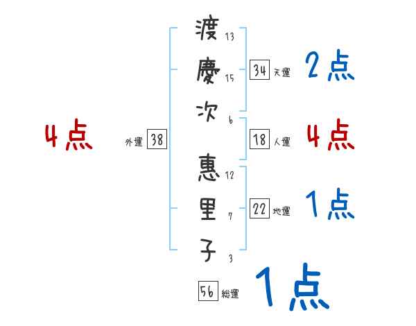外運![]() | 渡慶次惠里子さんの外運は38画の4つ星!温厚な性格で技術的な才能を発揮する。職人的な仕事に向いている。 生活面を象徴する運勢です。外部から受ける影響力を表し、結婚運、家庭運や職場、環境への順応性を表します。 |