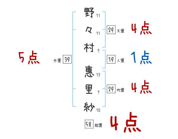 天運![]() | 野々村惠里紗さんの天運は29画の4つ星!完全主義で才能がある。厳格な心の持ち主。 家系が持つ宿命的な運勢を表します。祖先から受け継いだ苗字ですので自分の力が及びません。家柄を象徴します。 |