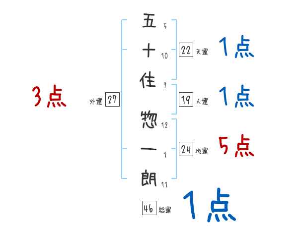 外運![]() | 五十住惣一朗さんの外運は27画の3つ星!頭脳明晰だが強情で摩擦が多い傾向。孤立に注意。 生活面を象徴する運勢です。外部から受ける影響力を表し、結婚運、家庭運や職場、環境への順応性を表します。 |