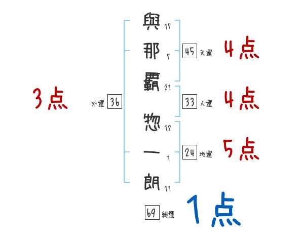 天運![]() | 與那覇惣一朗さんの天運は45画の4つ星!もくもくと物事を進め達成する。地味な努力家。 家系が持つ宿命的な運勢を表します。祖先から受け継いだ苗字ですので自分の力が及びません。家柄を象徴します。 |