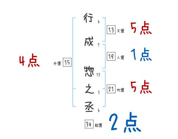 天運![]() | 行成惣之丞さんの天運は13画の5つ星!才能に恵まれ人気がある。名声を手に入れる。円満な人生。 家系が持つ宿命的な運勢を表します。祖先から受け継いだ苗字ですので自分の力が及びません。家柄を象徴します。 |