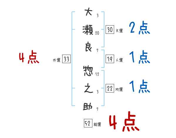 天運![]() | 大瀬良惣之助さんの天運は30画の2つ星!浮き沈みの激しさに注意しましょう。 家系が持つ宿命的な運勢を表します。祖先から受け継いだ苗字ですので自分の力が及びません。家柄を象徴します。 |