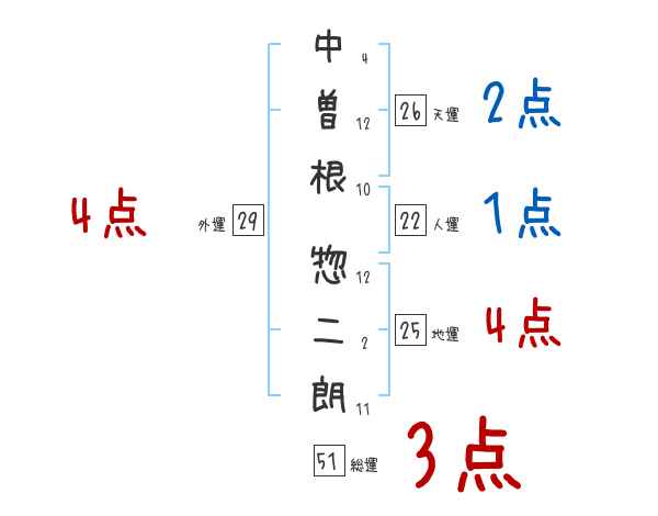 外運![]() | 中曽根惣二朗さんの外運は29画の4つ星!完全主義で才能がある。厳格な心の持ち主。 生活面を象徴する運勢です。外部から受ける影響力を表し、結婚運、家庭運や職場、環境への順応性を表します。 |