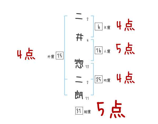 人運![]() | 二井惣二朗さんの人運は16画の5つ星!人望が厚く大きく発展する。逆転成功が見える。 性格や才能などを表す2番目に重要な運勢です。人間関係や協調性、社会的な成功に影響します。主に20歳から50歳ぐらいまでの中年期の運勢を表します。 |