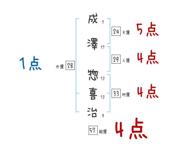 総運![]() | 成澤惣喜治さんの総運は57画の4つ星!向上心があり人望がある。地位を得る。 あなたの人生を表す1番重要な運勢です。生涯を通じて影響する総合運となり、主に50歳以降の晩年期に影響を及ぼします。 |
