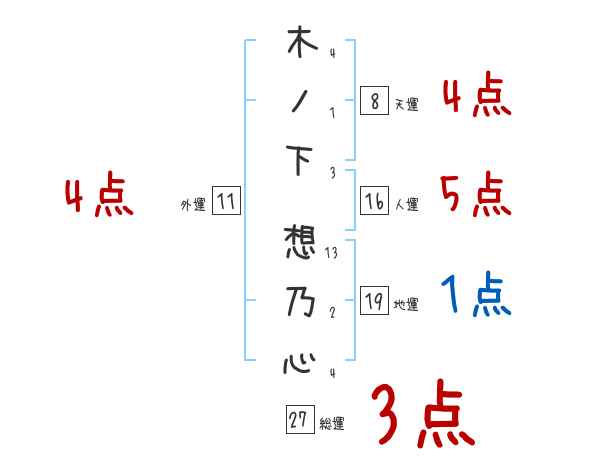 外運![]() | 木ノ下想乃心さんの外運は11画の4つ星!着実に富や地位を得る幸運な人生。 生活面を象徴する運勢です。外部から受ける影響力を表し、結婚運、家庭運や職場、環境への順応性を表します。 |