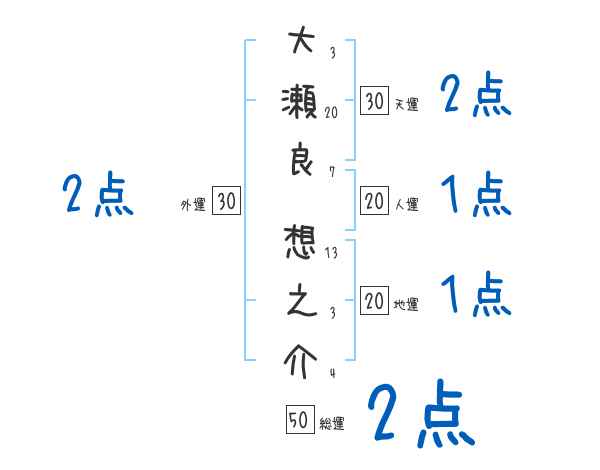 総運![]() | 大瀬良想之介さんの総運は50画の2つ星!浮き沈みが激しく不安定。しりすぼみに衰退しやすいので注意しましょう。 あなたの人生を表す1番重要な運勢です。生涯を通じて影響する総合運となり、主に50歳以降の晩年期に影響を及ぼします。 |
