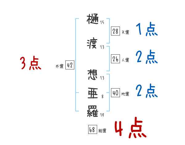 外運![]() | 樋渡想亜羅さんの外運は42画の3つ星!病気に注意。多芸であるが消極的でおとなしい。 生活面を象徴する運勢です。外部から受ける影響力を表し、結婚運、家庭運や職場、環境への順応性を表します。 |