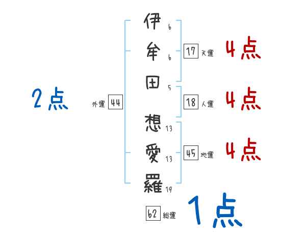 外運![]() | 伊牟田想愛羅さんの外運は44画の2つ星!誠実で慎重な性格。物事を考えすぎないように注意しましょう。 生活面を象徴する運勢です。外部から受ける影響力を表し、結婚運、家庭運や職場、環境への順応性を表します。 |