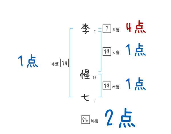 天運![]() | 李惺七さんの天運は7画の4つ星!強い意志や信念を持ち独立心が強い。自立する。 家系が持つ宿命的な運勢を表します。祖先から受け継いだ苗字ですので自分の力が及びません。家柄を象徴します。 |