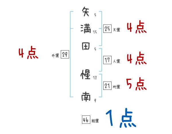 外運![]() | 矢満田惺南さんの外運は29画の4つ星!完全主義で才能がある。厳格な心の持ち主。 生活面を象徴する運勢です。外部から受ける影響力を表し、結婚運、家庭運や職場、環境への順応性を表します。 |