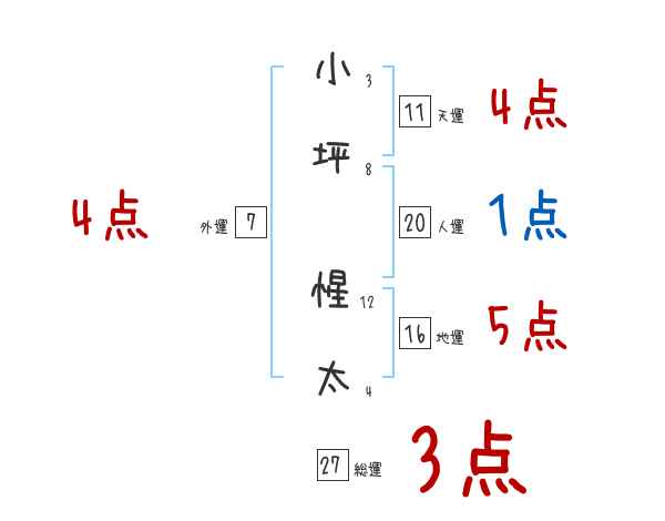 天運![]() | 小坪惺太さんの天運は11画の4つ星!着実に富や地位を得る幸運な人生。 家系が持つ宿命的な運勢を表します。祖先から受け継いだ苗字ですので自分の力が及びません。家柄を象徴します。 |