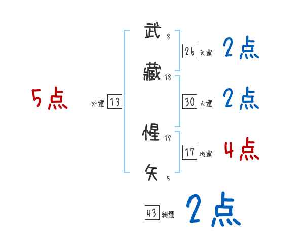 総運![]() | 武藏惺矢さんの総運は43画の2つ星!頑固な性格で独立心が強いかも。やや非現実的で浪費に注意しましょう。 あなたの人生を表す1番重要な運勢です。生涯を通じて影響する総合運となり、主に50歳以降の晩年期に影響を及ぼします。 |