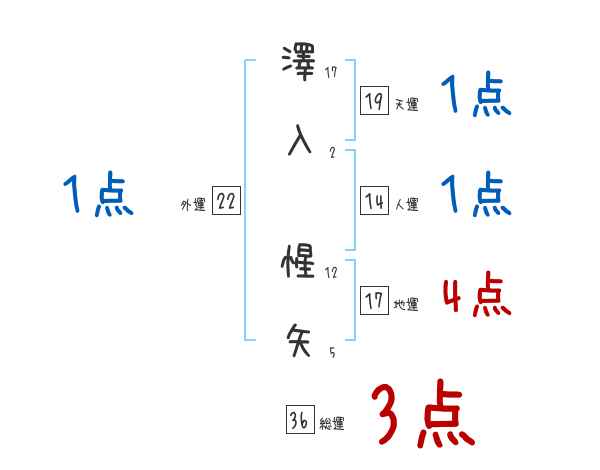 総運![]() | 澤入惺矢さんの総運は36画の3つ星!先見性が豊かです。多少神経質で苦労することも。 あなたの人生を表す1番重要な運勢です。生涯を通じて影響する総合運となり、主に50歳以降の晩年期に影響を及ぼします。 |
