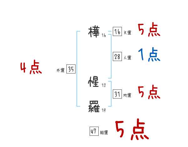 外運![]() | 樺惺羅さんの外運は35画の4つ星!温厚な性格で感受性が高い。穏和な性格で人望が厚い。 生活面を象徴する運勢です。外部から受ける影響力を表し、結婚運、家庭運や職場、環境への順応性を表します。 |