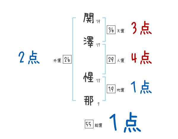 外運![]() | 関澤惺那さんの外運は26画の2つ星!波瀾万丈かも。信頼できる人を大事にしましょう。 生活面を象徴する運勢です。外部から受ける影響力を表し、結婚運、家庭運や職場、環境への順応性を表します。 |