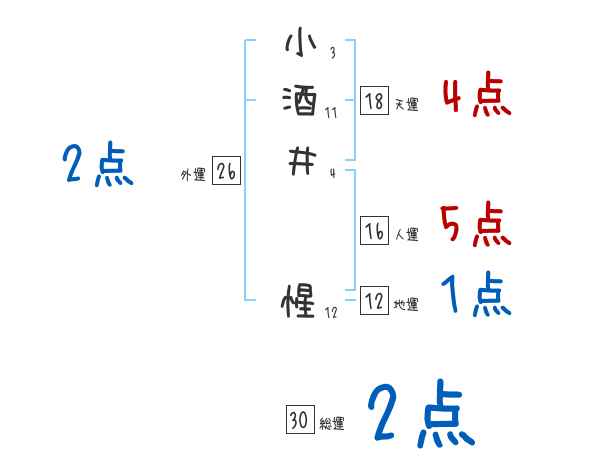 外運![]() | 小酒井惺さんの外運は26画の2つ星!波瀾万丈かも。信頼できる人を大事にしましょう。 生活面を象徴する運勢です。外部から受ける影響力を表し、結婚運、家庭運や職場、環境への順応性を表します。 |