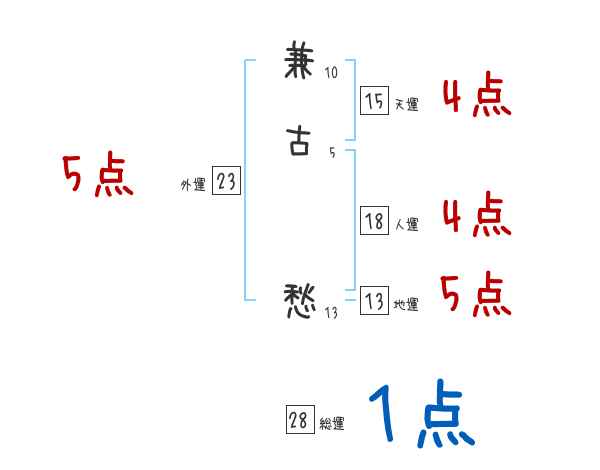 総運![]() | 兼古愁さんの総運は28画の1つ星!家庭環境に注意。スポーツで活躍できる能力があるかも。 あなたの人生を表す1番重要な運勢です。生涯を通じて影響する総合運となり、主に50歳以降の晩年期に影響を及ぼします。 |