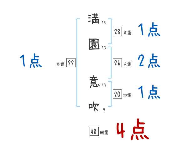 天運![]() | 満園意吹さんの天運は28画の1つ星!家庭環境に注意。スポーツで活躍できる能力があるかも。 家系が持つ宿命的な運勢を表します。祖先から受け継いだ苗字ですので自分の力が及びません。家柄を象徴します。 |