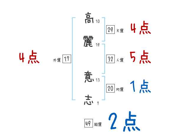 人運![]() | 高麗意志さんの人運は32画の5つ星!柔軟性があり成功する。チャンスが多く金運が良い。 性格や才能などを表す2番目に重要な運勢です。人間関係や協調性、社会的な成功に影響します。主に20歳から50歳ぐらいまでの中年期の運勢を表します。 |