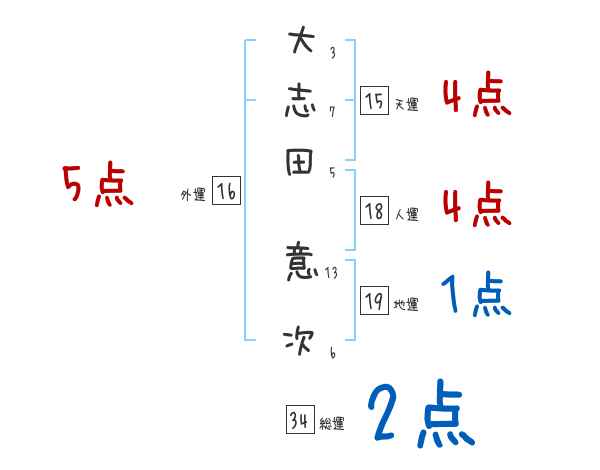 外運![]() | 大志田意次さんの外運は16画の5つ星!人望が厚く大きく発展する。逆転成功が見える。 生活面を象徴する運勢です。外部から受ける影響力を表し、結婚運、家庭運や職場、環境への順応性を表します。 |