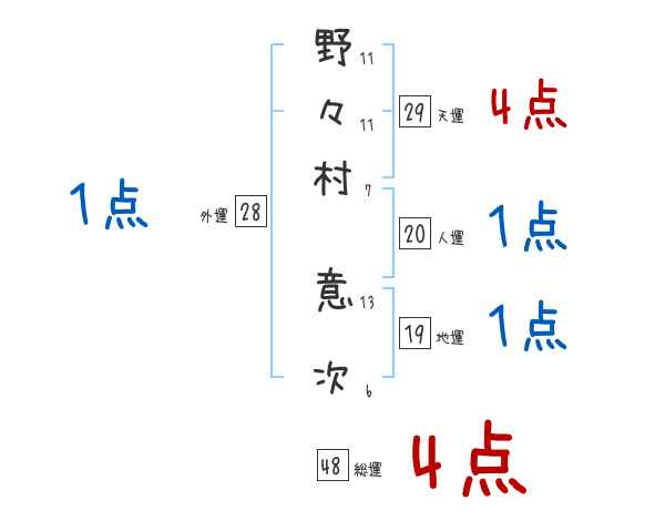 外運![]() | 野々村意次さんの外運は28画の1つ星!家庭環境に注意。スポーツで活躍できる能力があるかも。 生活面を象徴する運勢です。外部から受ける影響力を表し、結婚運、家庭運や職場、環境への順応性を表します。 |