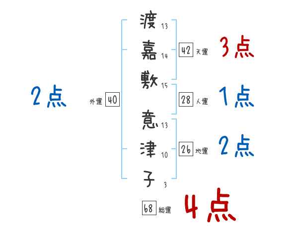 天運![]() | 渡嘉敷意津子さんの天運は42画の3つ星!病気に注意。多芸であるが消極的でおとなしい。 家系が持つ宿命的な運勢を表します。祖先から受け継いだ苗字ですので自分の力が及びません。家柄を象徴します。 |