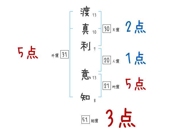 天運![]() | 渡真利意知さんの天運は30画の2つ星!浮き沈みの激しさに注意しましょう。 家系が持つ宿命的な運勢を表します。祖先から受け継いだ苗字ですので自分の力が及びません。家柄を象徴します。 |